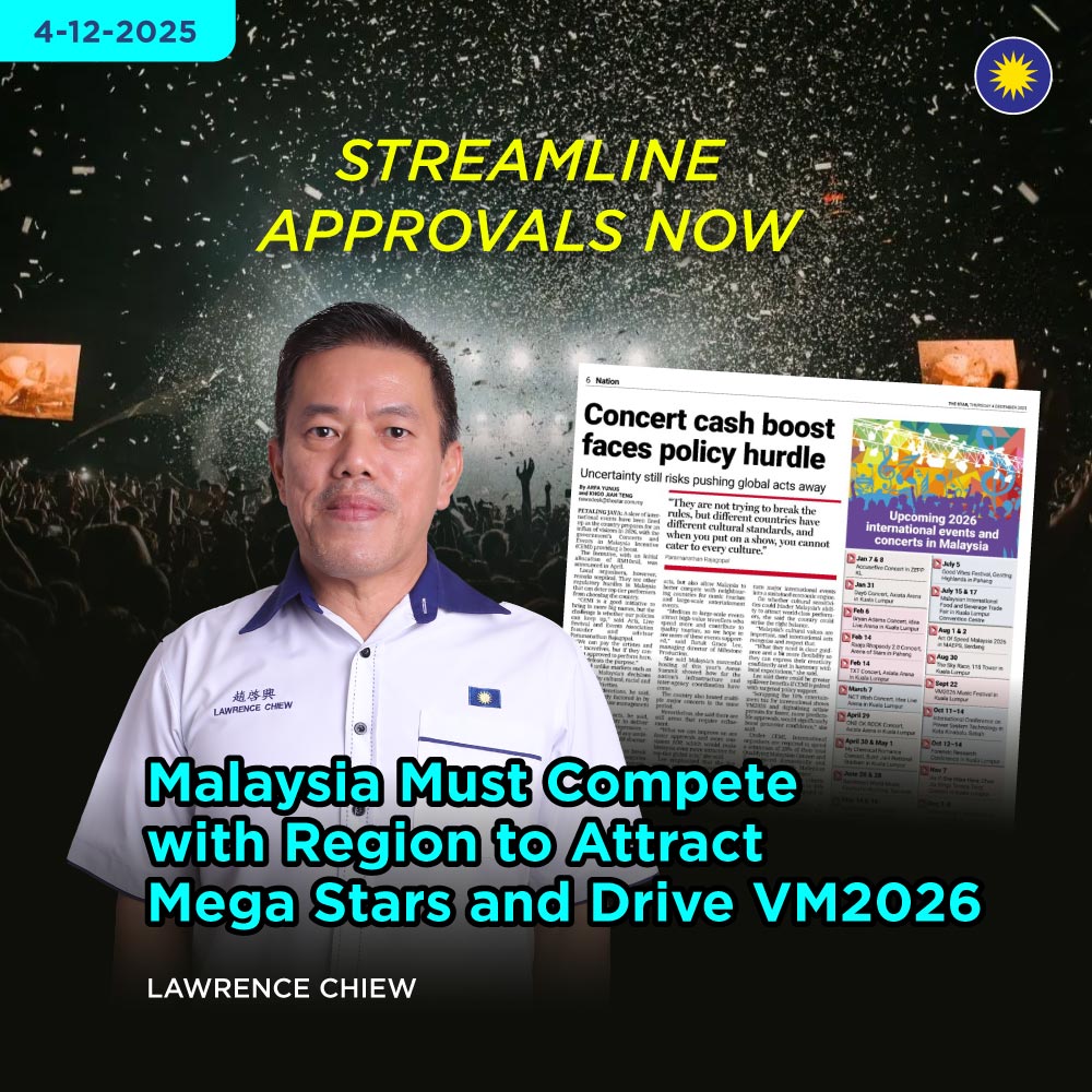 With VM2026 around the corner, Malaysia cannot afford to lose out again. If we continue with slow approvals, inconsistent decisions and last-minute cancellations, global acts and accompanying tourists will simply choose Singapore, Bangkok or Jakarta.