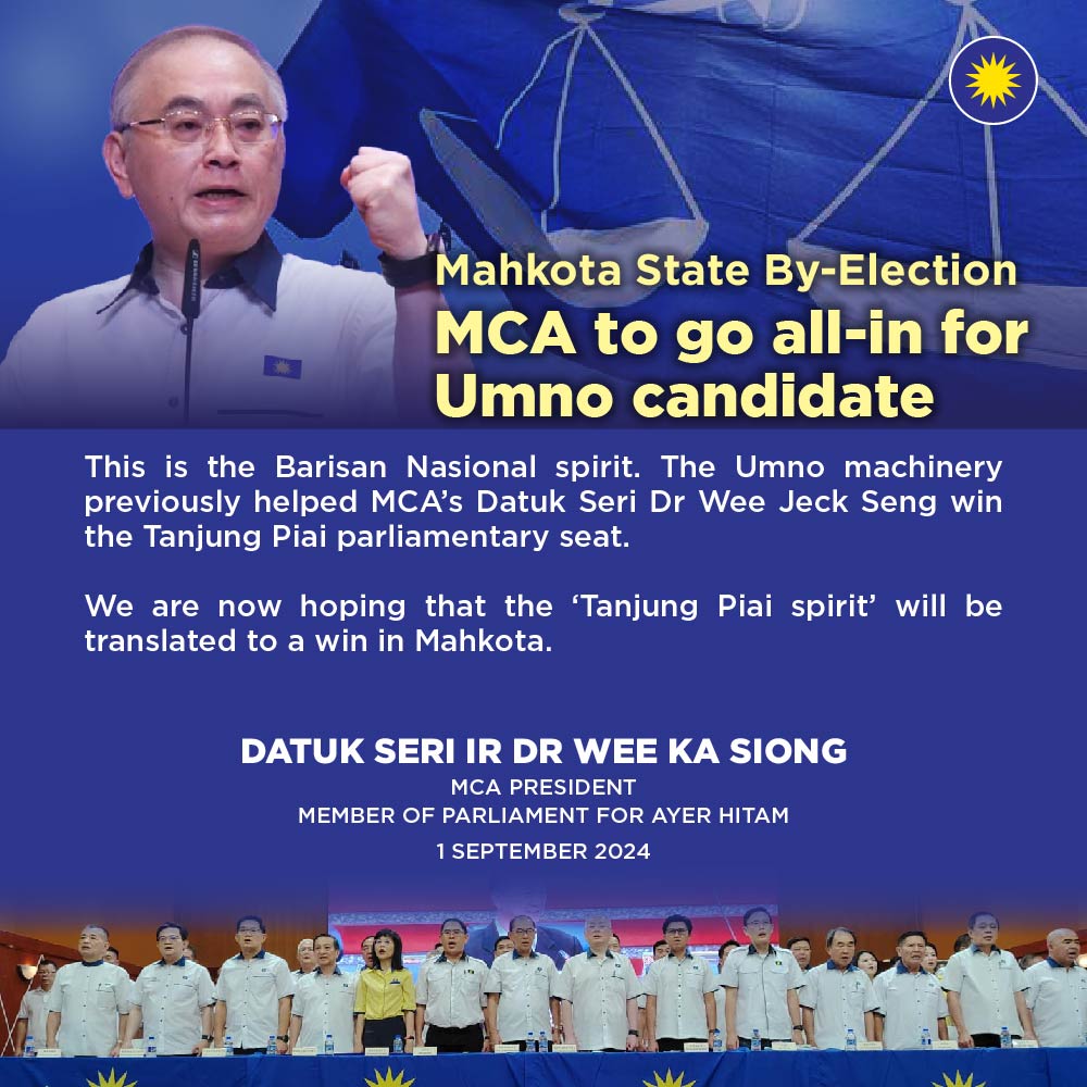The MCA president said Umno will field a candidate in Mahkota and MCA will do its best to help the candidate.
