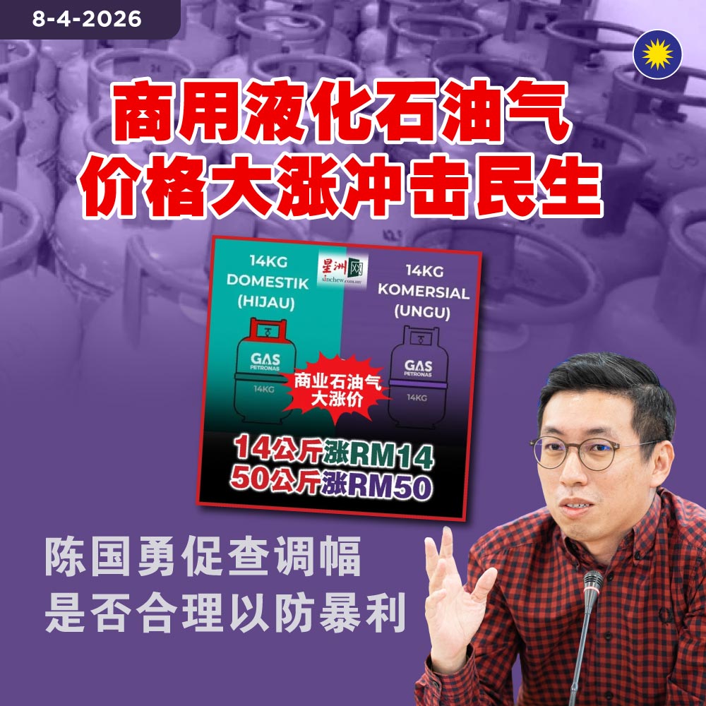 马华消费人事务局主任陈国勇表示,本月6日起商业用途液化石油气(LPG)大幅调涨,势必直接冲击民生。他指出,中东战事虽然引发国际原油价格波动,但政府有责任确保国内各类商品价格调整处于合理范围内,避免商业成本激增引发严重的通胀连锁反应。