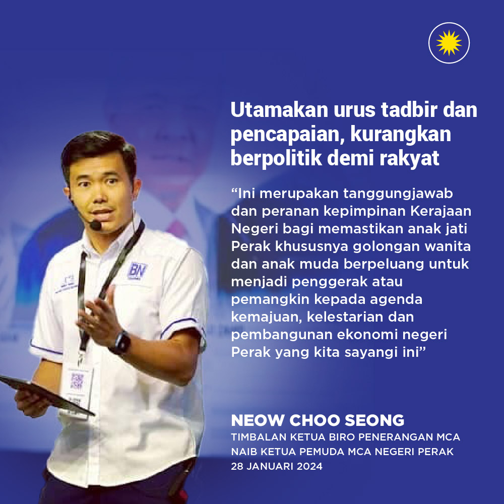 Kerajaan Negeri Perak disaran memberi keutamaan kepada urus tadbir negeri dan mengukuhkan perpaduan di kalangan parti-parti gabungan dalam Kerajaan Perpaduan, kata Timbalan Ketua Biro Penerangan MCA, Neow Choo Seong.